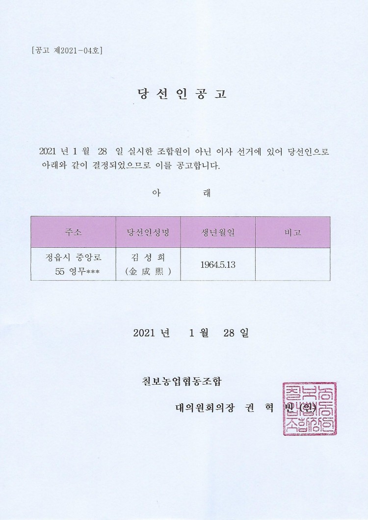 조합원이 아닌 이사(사외이사) 당선인 공고 페이지 정보 작성자 칠보농협 작성일21-01-28 15:05 조회3,684회 댓글0건 관련링크 이전글 다음글 목록 본문 2021.1.28. 실시된 조합원이 아닌 이사(사외이사)선거에 있어 붙임과 같이 당선인이 결정되었기에공고합니다. 붙 임 : 당선인 공고 1부 끝. 댓글목록 등록된 댓글이 없습니다. 이전글 다음글 목록
