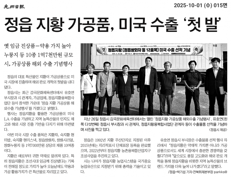 정읍 지황 가공품, 미국 수출 '첫발' 페이지 정보 작성자 칠보농협 작성일25-10-15 14:10 조회226회 댓글0건 관련링크 이전글 다음글 목록 본문 정읍시, 정읍지황 가공상품 美 LA 첫 수출...해외시장 개척 본격 댓글목록 등록된 댓글이 없습니다. 이전글 다음글 목록